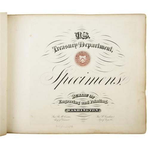 <B>Treasury Department Vignette Book.</B></I><BR> We sold this beautiful vignette book once before about a dozen years ago. At that time we described it: "An original Treasury Department book produced by the Bureau of Engraving and Printing between 3/18/1869 and 2/21/1876. This wonderful book has 110 full page vignettes and a specially prepared title page with the Treasury Seal. Apparently formerly from the library of Glenn Smedley as his light green rubber stamp appears on the blank flyleaf along with the date 11/5. According to a carefully prepared typed sheet which accompanies the book, a total of 44 of the vignettes were used on U.S. Currency and each is identified by page number and Friedberg design number. We have seen less than 10 of these books in total in all shapes, sizes and conditions and this is the first we have had the pleasure to offer [from the perspective of a dozen years ago, that is]. The overall condition is Superb with all 110 vignettes bright and clean." Since that time, we've seen a few more books, but this remains one of the very nicest we have had the pleasure of handling. A particularly important book due to the high percentage of vignettes that actually appear on US notes.<BR><BR><b>Shipping:</b> Coins & Currency (<a target="_blank" href="http://www.heritageauctions.com/common/shipping.php">view shipping information</a>)