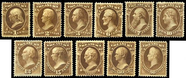 */(*) Treasury Dept., 1873, 1¢-90¢ Complete. O.g. (2¢ without gum). Excellent color. 6¢ with some short perfs. Generally Fine to Very Fine.