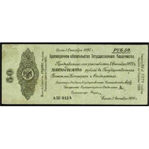 <style type="text/css"> body, td, th { font-family: Arial, Helvetica, sans-serif; font-size: 12px; color: #482424; margin: 0px; padding: 0px; } #header { background-image: url(http://www.bowersandmerena.com/ebay/images/template_v3_01.gif); clear: both; background-color: #590303; border-top-width: 2px; border-top-style: solid; border-top-color: #B38C4F; } #header #header_wrapper { height: 75px; clear: both; width: 800px; margin-right: auto; margin-left: auto; background-image: url(http://www.bowersandmerena.com/ebay/images/template_v3_03.gif); background-repeat: no-repeat; background-position: right; color: #F3EDCC; } #header #header_wrapper #header_logo { float: left; height: 75px; width: 444px; background-image: url(http://www.bowersandmerena.com/ebay/images/template_v3_02.gif); background-repeat: no-repeat; font-size: 10px; text-transform: capitalize; color: #B38C4F; } #header #header_wrapper #header_right { float: left; height: 75px; width: 356px; text-align: right; } #header #header_wrapper #header_right #headerLoginBtn { margin-bottom: 30px; } #header #header_wrapper #header_right input#txtSearch { color: #B49056; border: 1px solid #B49056; width: 175px; padding-top: 3px; padding-right: 3px; padding-bottom: 4px; padding-left: 3px; } #nav { height: 37px; background-image: url(http://www.bowersandmerena.com/ebay/images/template_v3_05.gif); clear: both; } #nav #nav_wrapper { height: 35px; width: 800px; margin-right: auto; margin-left: auto; border-left-width: 1px; border-left-style: solid; border-left-color: #B38C4F; } #nav #nav_wrapper a { padding-right: 15px; padding-left: 15px; border-right-width: 1px; border-right-style: solid; border-right-color: #B38C4F; height: 25px; padding-top: 10px; display: block; float: left; text-decoration: none; font-weight: bold; color: #5D0303; } #nav #nav_wrapper a:hover { color: #B38C4F; } #nav #nav_wrapper #search { float: right; padding-top: 7px; } #nav #nav_wrapper #search #txtSearch { font-family: Arial, Helvetica, sans-serif; font-size: 10px; text-transform: uppercase; color: #D2AE75; border: 1px solid #B38C4F; padding: 3px; } #content_bgd { background-image: url(http://www.bowersandmerena.com/ebay/images/template_v3_09.gif); background-repeat: repeat-y; background-position: center; padding-top: 15px; padding-bottom: 15px; background-color: #FBFBDB; } #content_wrapper { clear: both; height: auto; width: 800px; margin-right: auto; margin-left: auto; } .LotDetailWhite { line-height:normal; font-size:13px; font-family: arial,helvetica,sans-serif; color: White; font-weight: bold; } .LotDetailInformation { line-height:normal; font-size: 13px; font-family: arial,helvetica,sans-serif; } .LotDetailMessage { line-height:normal; font-size: 13px; font-family: arial,helvetica,sans-serif; color: red; } } tr.HeaderAuctionTitle td { color: #000000; font-weight: bold; padding: 2px; background-image: url(http://www.bowersandmerena.com/ebay/images/template_v3_05.gif); background-repeat: repeat-x; border-bottom-width: 1px; border-bottom-style: solid; border-bottom-color: #B38C4F; } table.AuctionSummary a, table.AuctionSummary a:link, table.AuctionSummary a:visited { color: #0000FF; text-decoration: none; } } td.tableHeaderLeft { border-left-width: 1px; border-left-style: solid; border-left-color: #B38C4F; } td.tableHeaderRight { border-right-width: 1px; border-right-style: solid; border-right-color: #B38C4F; } td.tableCellMiddle { border-left-width: 1px; border-left-style: solid; border-left-color: #B38C4F; border-right-width: 1px; border-right-style: solid; border-right-color: #B38C4F; padding: 5px; } tr.footer td { border-top-width: 1px; border-top-style: solid; border-top-color: #B38C4F; } </style> </head> <body> <div id="header"> <div id="header_wrapper"> <div id="header_logo"> </div> <div id="header_right"> </div> </div> </div> <div id="nav"> <div id="nav_wrapper"> <a href="http://www.bowersandmerena.com">Our eBayLive Auctions</a> <a href="#PaymentInfo">Payment Information</a> <a href="#ShippingInfo">Shipping Information</a> <a href="#About">About Bowers and Merena</a> </div> </div> <div id="content_bgd"> <div id="content_wrapper"> <table width="100%" border="0" cellpadding="5" cellspacing="0" class="AuctionSummary"> <tbody> <tr class="HeaderAuctionTitle" style="height: 25px;"> <td align="left" class="tableHeaderLeft" > </td> <td align="center" class="tableHeaderRight"> <span style="font-size: large;">Lot #2174. Siberia & Urals. Treasury Notes, 5% Government Debenture Obligations, 1919 Issue. </span> </td> </tr> <tr> <td colspan="3" class="tableCellMiddle"> Lot of 49 notes, with different color, paper and date varieties. Includes, 25 and 50 Rubles between P-S834 to P-S867B. Condition ranges from VF to CU. Highlight is an AU-CU, 50 Rubles, P-S867B. Scarce group of varieties not usually seen.