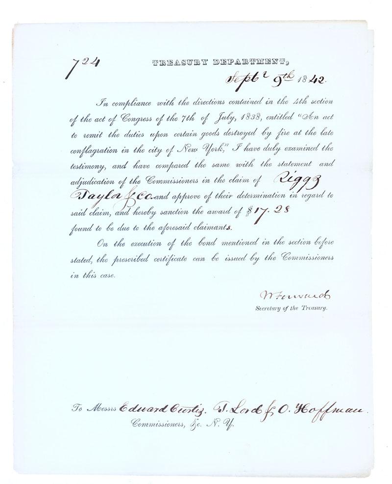 WALTER FORWARD DS. 1pp. 8" x 10". Treasury Department. Sept. 9th, 1842. A partly printed document signed "W Forward" as Treasury Secretary. The piece states: "In compliance with the directions contained in the 4th section of the act of Congress of the 7th of July, 1838, entitled 'An act to remit the duties upon certain goods destroyed by fire at the late conflagration in the city of New York,' I have duly examined the testimony, and have compared the same with the statement and adjudication of the Commissioners in the claim of Rigg & Taylor & Co.. and approve of their determination in regard to said claim, and hereby sanction the award of $17.28 found to be due to the aforesaid claimant. On the execution of the bond mentioned in the section before stated, the prescribed certificate can be issued by the Commissioners in this case." The piece is in choice condition.