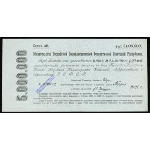 <style type="text/css"> body, td, th { font-family: Arial, Helvetica, sans-serif; font-size: 12px; color: #482424; margin: 0px; padding: 0px; } #header { background-image: url(http://www.bowersandmerena.com/ebay/images/template_v3_01.gif); clear: both; background-color: #590303; border-top-width: 2px; border-top-style: solid; border-top-color: #B38C4F; } #header #header_wrapper { height: 75px; clear: both; width: 800px; margin-right: auto; margin-left: auto; background-image: url(http://www.bowersandmerena.com/ebay/images/template_v3_03.gif); background-repeat: no-repeat; background-position: right; color: #F3EDCC; } #header #header_wrapper #header_logo { float: left; height: 75px; width: 444px; background-image: url(http://www.bowersandmerena.com/ebay/images/template_v3_02.gif); background-repeat: no-repeat; font-size: 10px; text-transform: capitalize; color: #B38C4F; } #header #header_wrapper #header_right { float: left; height: 75px; width: 356px; text-align: right; } #header #header_wrapper #header_right #headerLoginBtn { margin-bottom: 30px; } #header #header_wrapper #header_right input#txtSearch { color: #B49056; border: 1px solid #B49056; width: 175px; padding-top: 3px; padding-right: 3px; padding-bottom: 4px; padding-left: 3px; } #nav { height: 37px; background-image: url(http://www.bowersandmerena.com/ebay/images/template_v3_05.gif); clear: both; } #nav #nav_wrapper { height: 35px; width: 800px; margin-right: auto; margin-left: auto; border-left-width: 1px; border-left-style: solid; border-left-color: #B38C4F; } #nav #nav_wrapper a { padding-right: 15px; padding-left: 15px; border-right-width: 1px; border-right-style: solid; border-right-color: #B38C4F; height: 25px; padding-top: 10px; display: block; float: left; text-decoration: none; font-weight: bold; color: #5D0303; } #nav #nav_wrapper a:hover { color: #B38C4F; } #nav #nav_wrapper #search { float: right; padding-top: 7px; } #nav #nav_wrapper #search #txtSearch { font-family: Arial, Helvetica, sans-serif; font-size: 10px; text-transform: uppercase; color: #D2AE75; border: 1px solid #B38C4F; padding: 3px; } #content_bgd { background-image: url(http://www.bowersandmerena.com/ebay/images/template_v3_09.gif); background-repeat: repeat-y; background-position: center; padding-top: 15px; padding-bottom: 15px; background-color: #FBFBDB; } #content_wrapper { clear: both; height: auto; width: 800px; margin-right: auto; margin-left: auto; } .LotDetailWhite { line-height:normal; font-size:13px; font-family: arial,helvetica,sans-serif; color: White; font-weight: bold; } .LotDetailInformation { line-height:normal; font-size: 13px; font-family: arial,helvetica,sans-serif; } .LotDetailMessage { line-height:normal; font-size: 13px; font-family: arial,helvetica,sans-serif; color: red; } } tr.HeaderAuctionTitle td { color: #000000; font-weight: bold; padding: 2px; background-image: url(http://www.bowersandmerena.com/ebay/images/template_v3_05.gif); background-repeat: repeat-x; border-bottom-width: 1px; border-bottom-style: solid; border-bottom-color: #B38C4F; } table.AuctionSummary a, table.AuctionSummary a:link, table.AuctionSummary a:visited { color: #0000FF; text-decoration: none; } } td.tableHeaderLeft { border-left-width: 1px; border-left-style: solid; border-left-color: #B38C4F; } td.tableHeaderRight { border-right-width: 1px; border-right-style: solid; border-right-color: #B38C4F; } td.tableCellMiddle { border-left-width: 1px; border-left-style: solid; border-left-color: #B38C4F; border-right-width: 1px; border-right-style: solid; border-right-color: #B38C4F; padding: 5px; } tr.footer td { border-top-width: 1px; border-top-style: solid; border-top-color: #B38C4F; } </style> </head> <body> <div id="header"> <div id="header_wrapper"> <div id="header_logo"> </div> <div id="header_right"> </div> </div> </div> <div id="nav"> <div id="nav_wrapper"> <a href="http://www.bowersandmerena.com">Our eBayLive Auctions</a> <a href="#PaymentInfo">Payment Information</a> <a href="#ShippingInfo">Shipping Information</a> <a href="#About">About Bowers and Merena</a> </div> </div> <div id="content_bgd"> <div id="content_wrapper"> <table width="100%" border="0" cellpadding="5" cellspacing="0" class="AuctionSummary"> <tbody> <tr class="HeaderAuctionTitle" style="height: 25px;"> <td align="left" class="tableHeaderLeft" > </td> <td align="center" class="tableHeaderRight"> <span style="font-size: large;">Lot #2636. Russian Federation. Treasury Short Term Certificates, 1921 Issue.</span> </td> </tr> <tr> <td colspan="3" class="tableCellMiddle"> 1921, 5,000,000 Rubles, P-121, XF+ to AU condition, light water stain on small area on bottom left and blue Russian handstamp on left. Rare note.