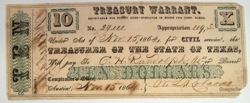 Treasure of the State of Texas warrant for $10.00 dated Nov 15, 1864. Signed by M L Robards