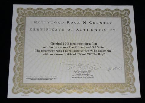 An original hand typed treatment for a film for Gloria Swanson titled "The Courtship" aka "Wind Off The Bay" by David Lang and Sol Stein.