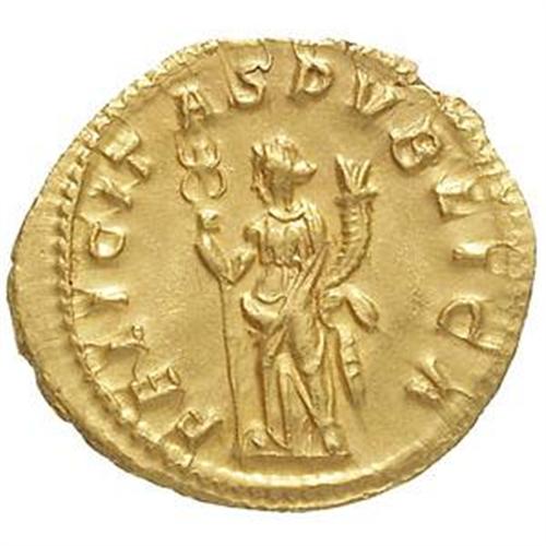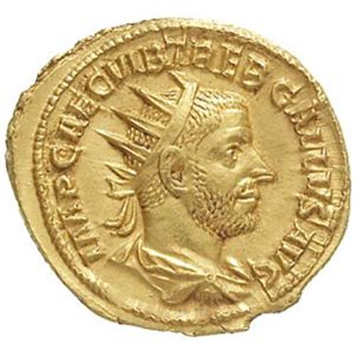 Roman Empire Coins. Treboniano Gallo (251-253). Binio o aureo pesante. D/ IMP CAE C VIB TREB GALLVS AVG. Busto radiato, drappeggiato e corazzato a destra. R/ FELICITAS PVBLICA. La Felicitas, stante a sinistra, tiene caduceo e cornucopia. RIC 147. C. 33. gr. 5.18 RRR. AU. Minima ondulazione dei campi, altrimenti SPL/qSPL. Molto raro.