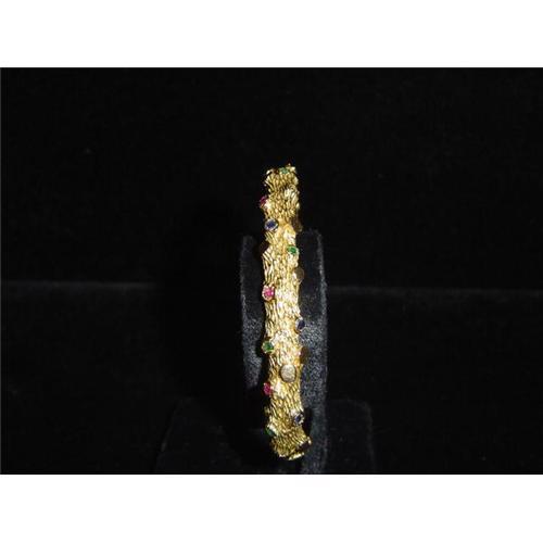 Circa. 1960. Tree Bark Bangle Bracelet. 14K gold tested with 14K acid. 5 rubies, 4 emeralds, 4 sapphires, all natural stones tested with refractive index liquid. Wrist opening measures 2.25 inches x 1.75 inches. In original, pristine condition.