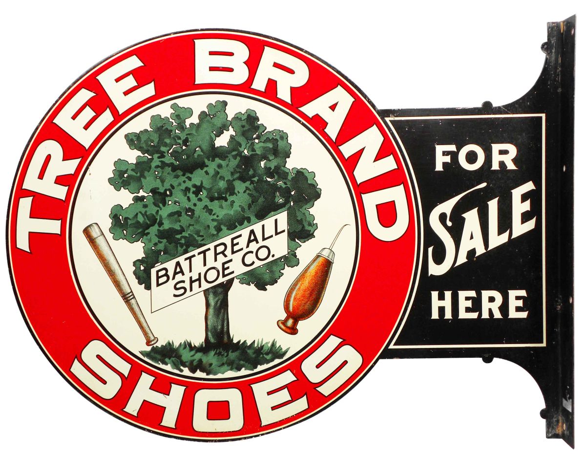Tree Brand Shoes and Battreal Shoe Company Die Cut Tin Flange Sign. Great color and graphics. A couple of minor scratches otherwise excellent condition. 18 X 13 1/2 inches.
