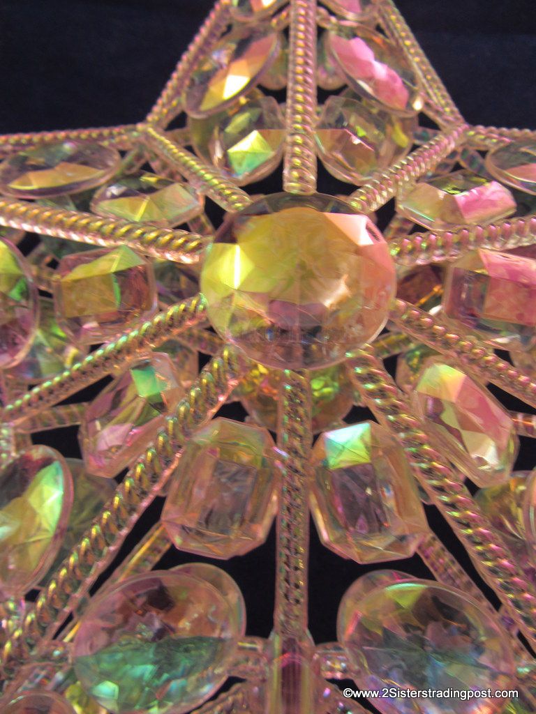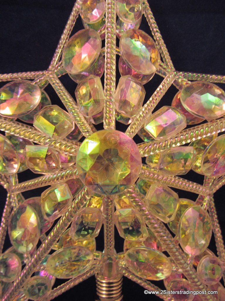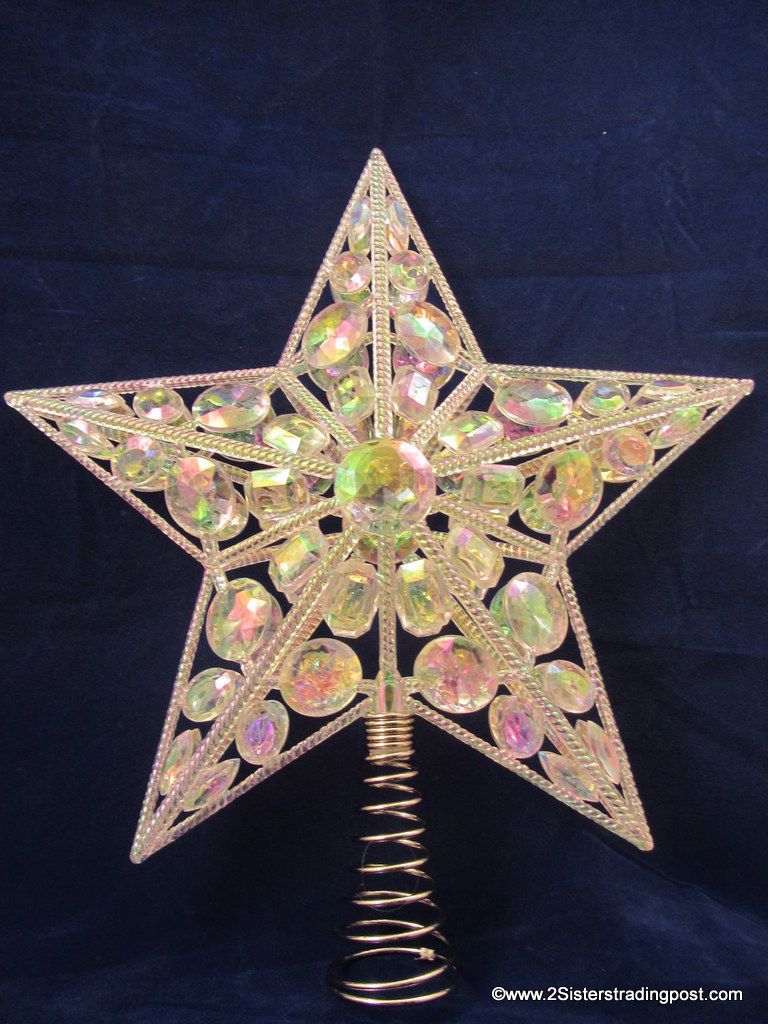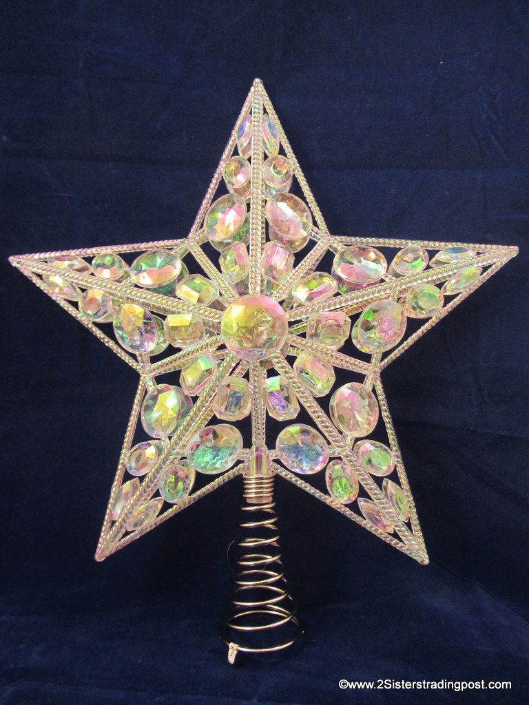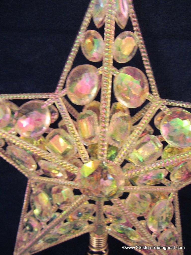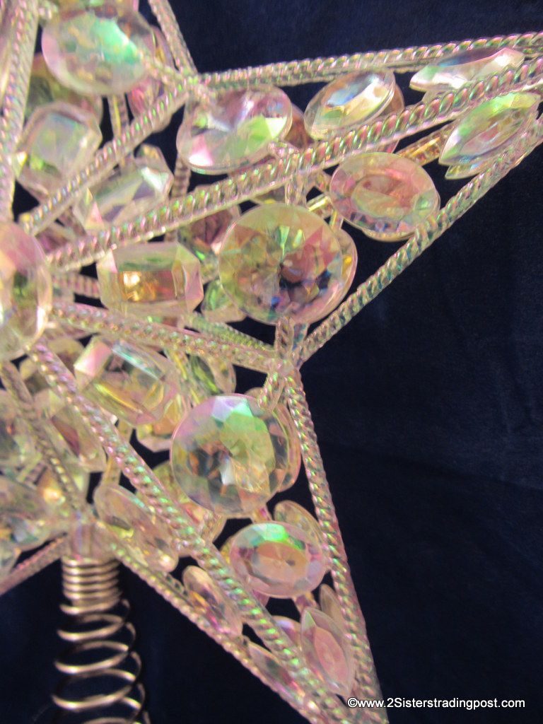 holds together crystal gem like prisms to adorn the top of your tree. Each side of the star has 41 gems. The prisms reflect the glittering lights from below. Star meas. 12" across x 13" tall. This is new without tags. The Made in tag is still on the spring of the topper. See images for details.