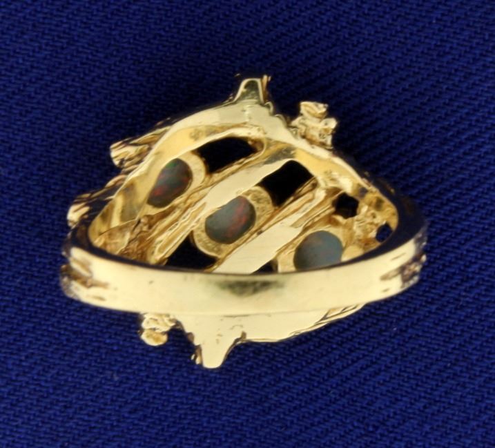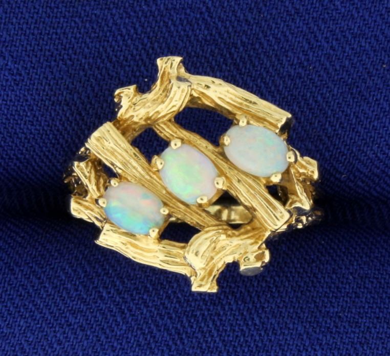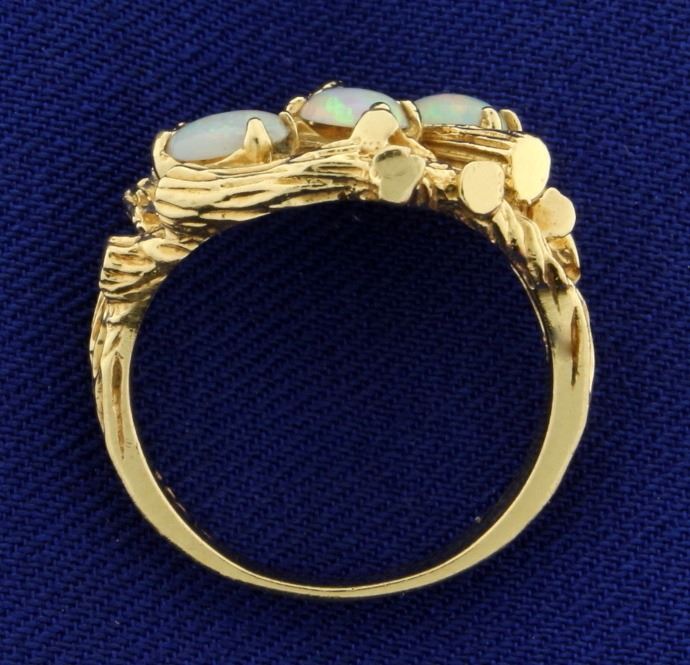 In 14k yellow gold. Contains three natural oval cut 5x3mm opals with excellent play of color with flashes of blue and pink. Unique setting looks like branches of tree. Size 5 1/2. 5.2g.