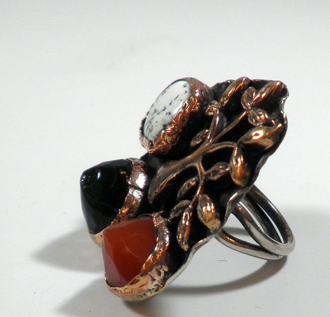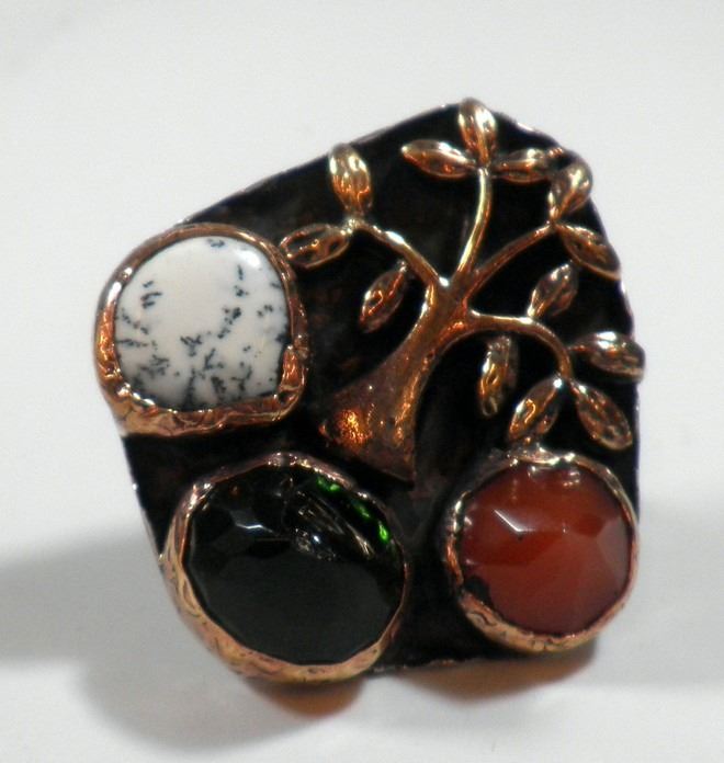 Tree-shaped silver and copper ring, set with 3 gemstones/glass pieces, green gemstone could be flawed, size 7, weight: 21.8 gm.