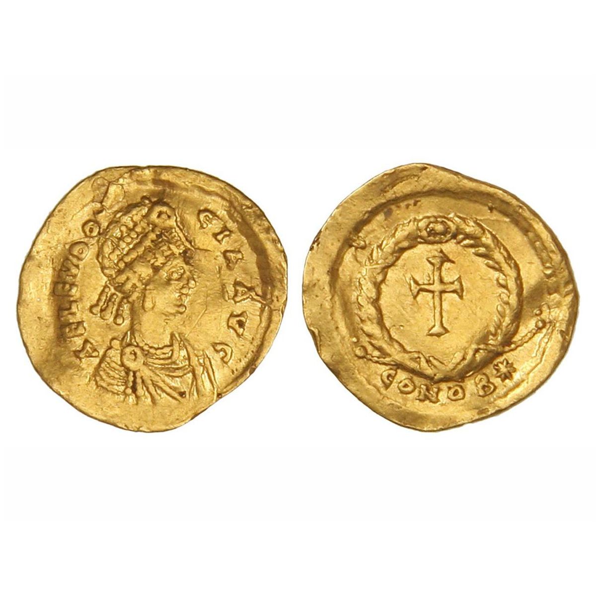 Tremisis. - 421-460 d.C. - EUDOCIA. - Anv.: AEL. EUDOCIA AVG. Busto a derecha con diadema. Rev.: En exergo: CONOB y estrella. Cruz orlada por guirnalda. 1,40 grs. AU. (Ligera rayita en anverso. Ligera ondulación). RARA. MBC+. - -