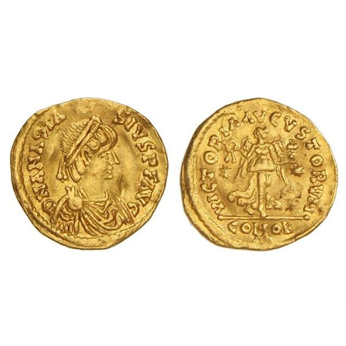 Tremisis. - 491-518 d.C. - ANASTASIO I. - Anv.: D. N. ANASTASIVS P. P. AVG. Busto a derecha con diadema. Rev.: VICTORIA AVGVSTORVM. En exergo: CONOB. Victoria en marcha a derecha, cabeza a izquierda con corona y globo crucífero. 1,40 grs. AU. S-5. EBC. - -