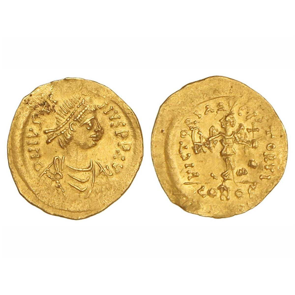 Tremisis. - 518-527 d.C. - JUSTINO I (518-527 d.C.). - CONSTANTINOPLA. - Anv.: D. N. JVSTINVS P. P. AVG. Busto diademado a derecha. Rev.: VICTORIA AVGVSTORVI. CONOB. Victoria a derecha. 1,50 grs. AU. Se-58. MBC+. - -