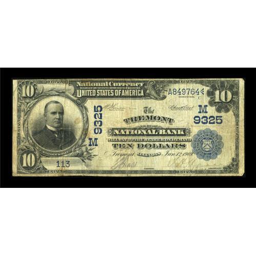 <B>Tremont, IL</B></I> - $10 1902 Date Back Fr. 618 <B>The Tremont NB</B></I> Ch. # (M)9325<BR> A <B>Fine</B></I> Tazewell County bank which operated for less than 20 years, issuing Date Backs and Plain Backs only, of which only two surviving examples have been documented by Kelly. This piece is pen signed by the 2nd Vice President, an office we do not recall having previously seen as a signer of any national.<BR><BR><b>Shipping:</b> Coins & Currency (<a target="_blank" href="http://www.heritageauctions.com/common/shipping.php">view shipping information</a>)