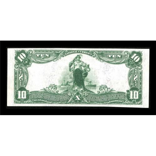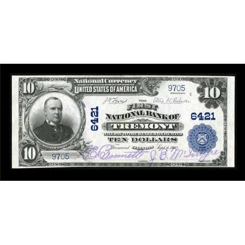 <B>Tremont, IL</B></I> - $10 1902 Plain Back Fr. 624 <B>The First NB</B></I> Ch. # 6421<BR> Good margins on all four sides, deep embossing, and bold stamped signatures add to the appearance of this example. However, the note has a lone diagonal fold on the left side that is nearly impossible to detect. <B>Choice About Uncirculated.</B></I><BR><BR><b>Shipping:</b> Coins & Currency (<a target="_blank" href="http://www.heritageauctions.com/common/shipping.php">view shipping information</a>)