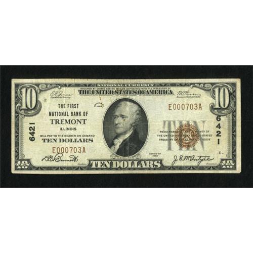 <B>Tremont, IL</B></I> - $10 1929 Ty. 1 <B>The First NB</B></I> Ch. # 6421<BR> This <B>Very Fine</B></I> $10 is one of just eight small size reported on this scarce Tazewell County bank that closed its doors in January of 1932.<BR><BR><b>Shipping:</b> Coins & Currency (<a target="_blank" href="http://www.heritageauctions.com/common/shipping.php">view shipping information</a>)