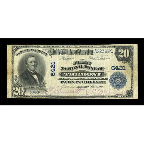 <B>Tremont, IL</B></I> - $20 1902 Plain Back Fr. 650 <B>The First NB</B></I> Ch. # 6421<BR> An evenly circulated example from this small Tazewell County community. <B>Fine,</B></I> with clear purple signatures of C.B. Bennett and J.E. McIntyre. <BR><BR><b>Shipping:</b> Coins & Currency (<a target="_blank" href="http://www.heritageauctions.com/common/shipping.php">view shipping information</a>)