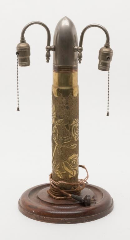 “Trench Art” lamp with shell body showing flowers; approx. 22” in height; good condition overall with original wiring needing re-wiring before use. Sold as a collectible only; DO NOT SHOOT OR LIGHT UP. Est.: $150-$300.