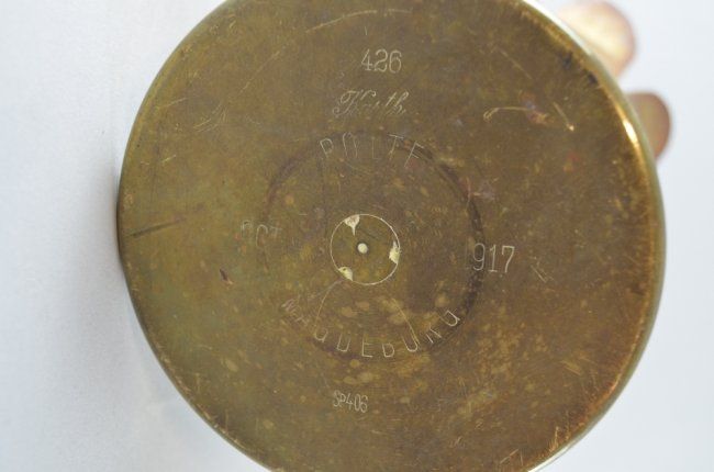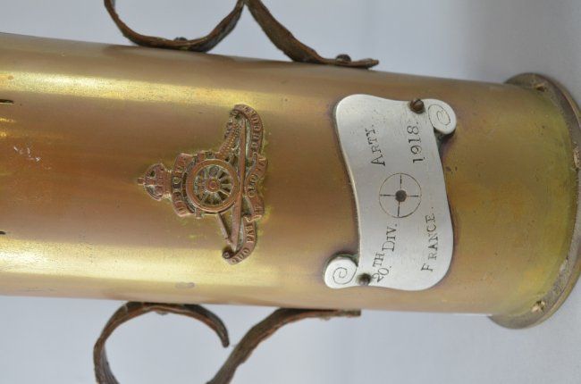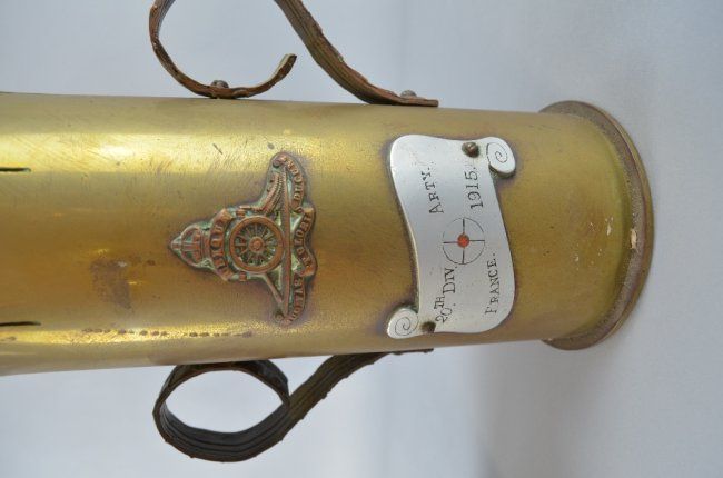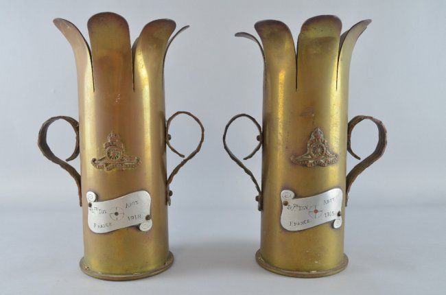 Trench Art; pair of brass shell case vases 20th Div Arty France 1915, 12.5" high