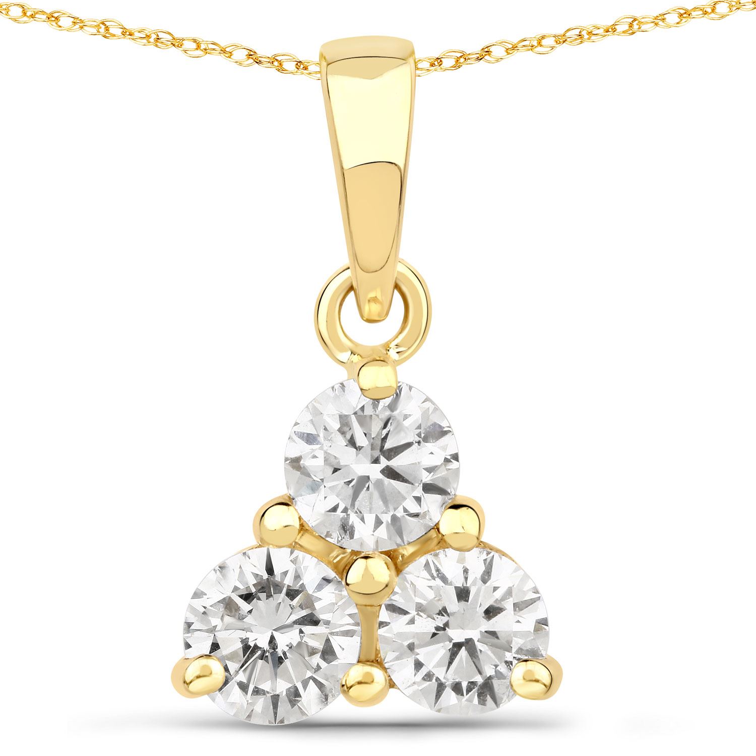 This 14 karat yellow gold necklace features three beautiful lab-grown diamonds in a trefoil design.& nbsp; The .75 carats of round, brilliant-cut, colorless, VS clarity, lab-grown diamonds are prong-set and suspended from a solid bail attached to an affixed ring at the top of the trefoil, in a 'doorknocker' style. The necklace includes a 14K yellow gold, 18& quot; fine rope chain with a lobster clasp, but the bail can accommodate up to a 2mm chain.