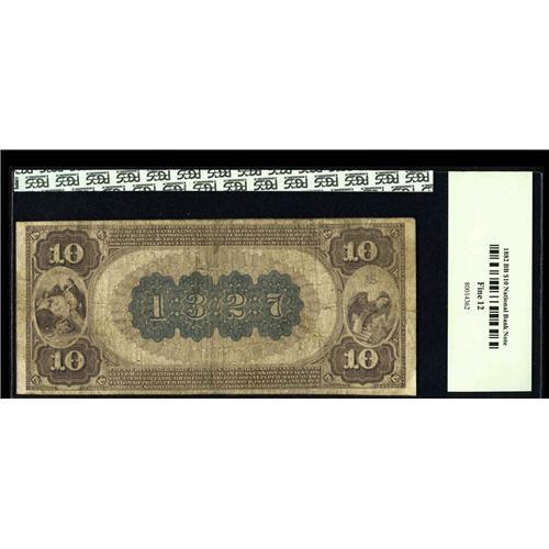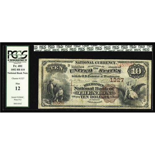<B>Trenton, NJ</B></I> - $10 1882 Brown Back Fr. 481 <B>The Mechanics NB</B></I> Ch. # 1327<BR>Four ample margins and being just one of three $10 Brown Backs in the census more than makes up for the faded signatures. <B>PCGS Fine 12.</B></I>