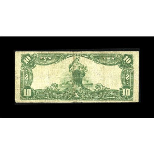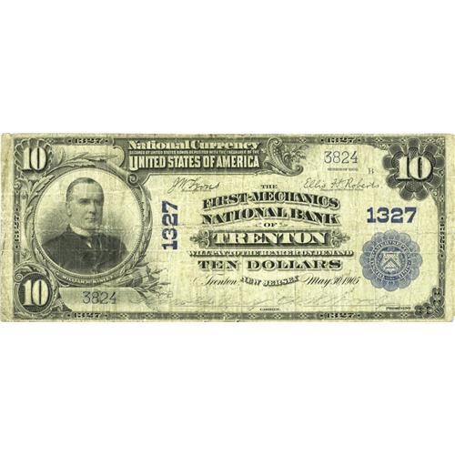 <B>Trenton, NJ</B></I> - $10 1902 Plain Back Fr. 624 <B>The Mechanics NB</B></I> Ch. # 1327<BR>In 1928, this Mercer County bank took over the First National Bank and assumed its circulation. So close to the changeover to small size currency in 1929, a relatively small group of large size notes with the amended title were issued. Today, they are between four and five times scarcer than the first title survivors. This <B>Fine</B></I> may have been wet at one time but faces up well.