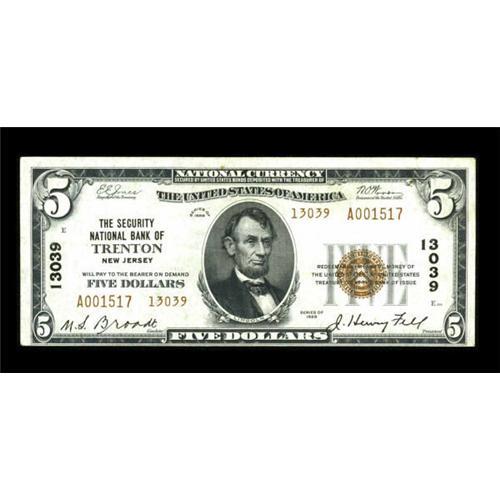 <B>Trenton, NJ</B></I> - $5 1929 Ty. 2 <B>The Security NB</B></I> Ch. # 13039<BR> The only denomination issued by this very scarce state capital bank . Nice clean <B>Very Fine-Extremely Fine</B></I>.<BR><BR><b>Shipping:</b> Coins & Currency (<a target="_blank" href="http://www.heritageauctions.com/common/shipping.php">view shipping information</a>)