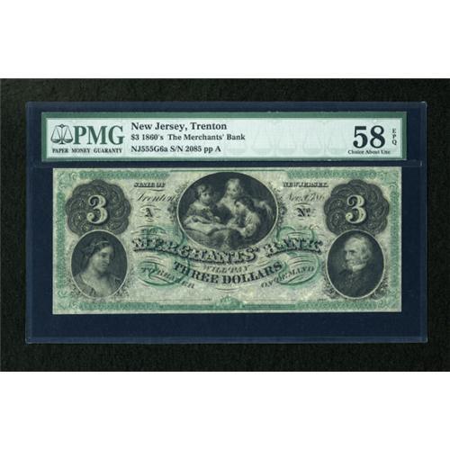 <B>Trenton, NJ- Merchants Bank</B></I> $3 Nov. 20, 1861 G6a<BR> The National Bank Note Company produced quality notes and the highlight of this obsolete is the vignette of the children studying. This is only the third time we have handled an issued note from this institution. <B>PMG Choice About Unc 58 EPQ.</B></I><BR><BR><b>Shipping:</b> Coins & Currency (<a target="_blank" href="http://www.heritageauctions.com/common/shipping.php">view shipping information</a>)