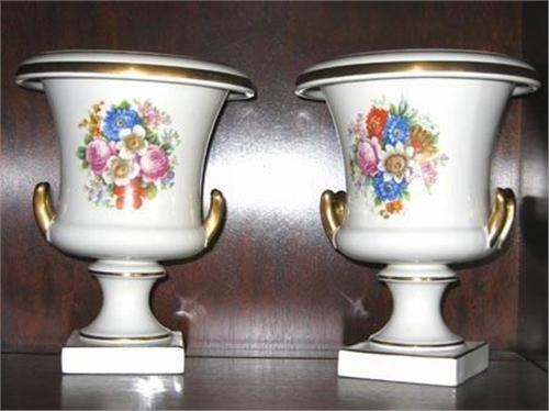Beautiful pair of signed Trenton Potteries handled, footed urns. High gloss glaze over white porcelain. Xfer floral motif. HP gold trim. Fully hallmarked. 8"t. 8lbs. (22-87)