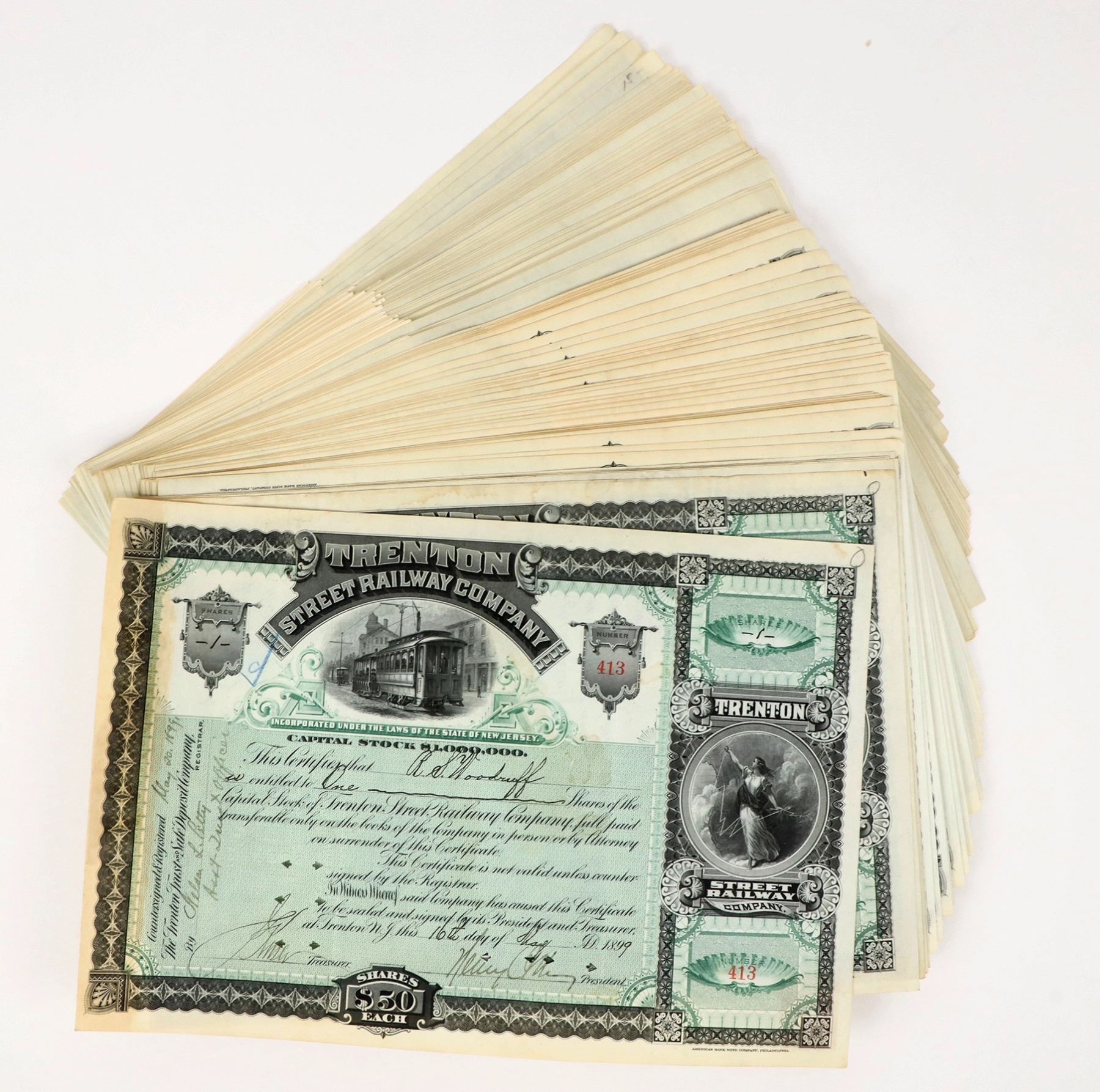Trenton Street Railway Company non-sequential stock certificates, all black and green, ~9 pcs. signed without stubs, 11 x 7.625 in. ~80 unissued with stubs attached, 11 x 7.625 in. w/ 5 in. ledger tab.