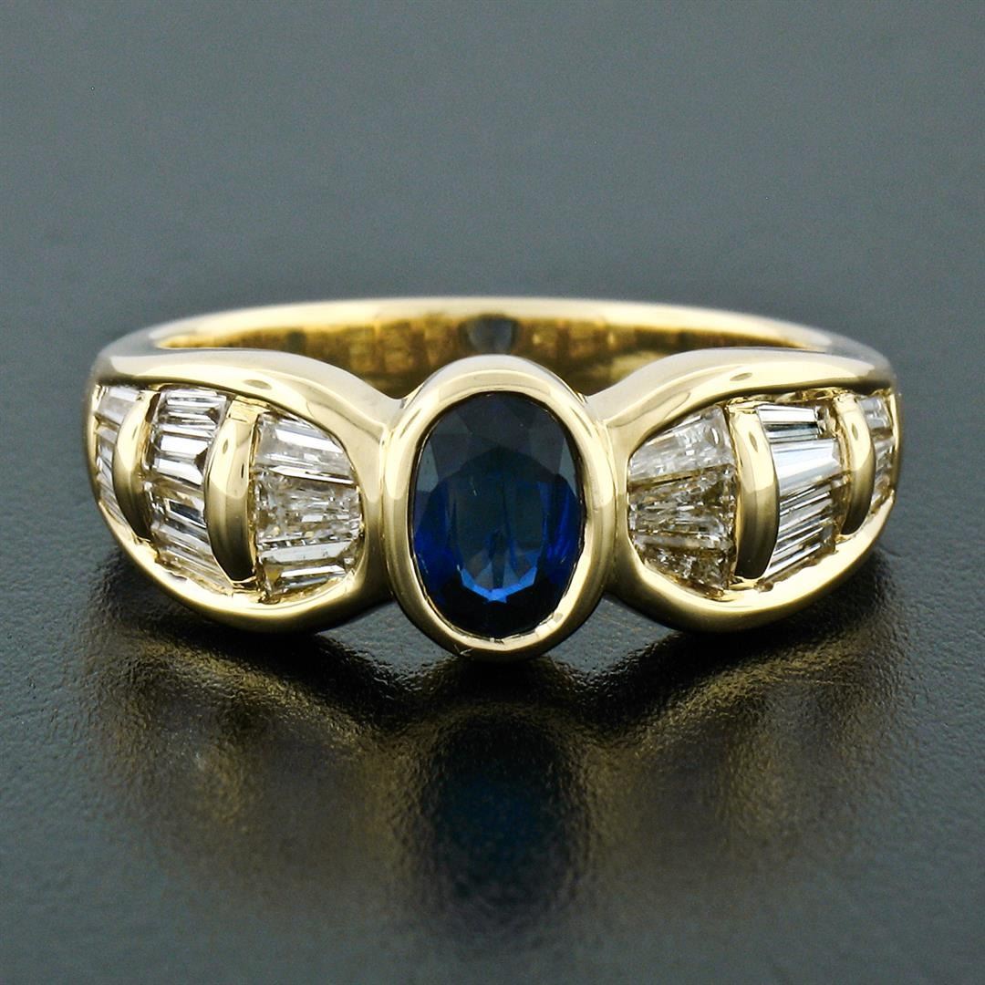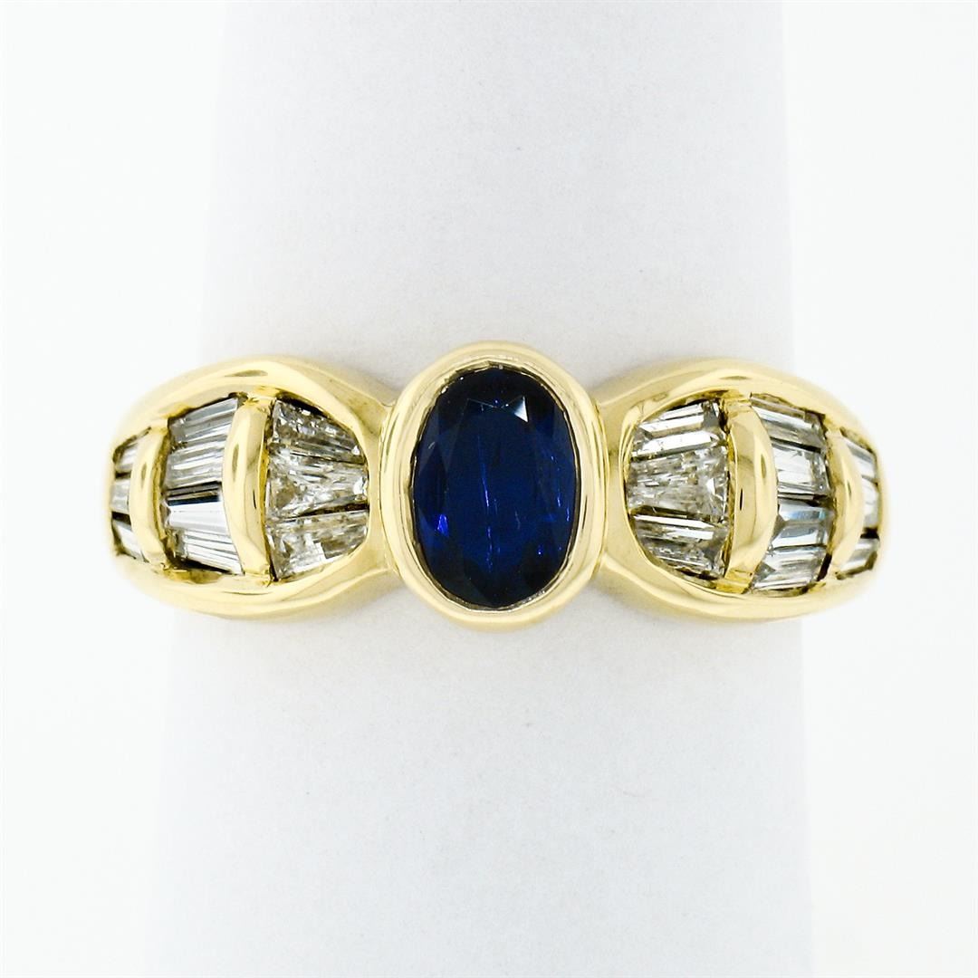 An 18k yellow gold ring made by Trevi featuring an oval cut blue sapphire (0.80ct) and 20 baguette cut diamonds (H/I - VS1/VS2; 1.10ctw). The ring is size 7.5, weighs a total of 7.46 grams, and measures 7.85mm wide.