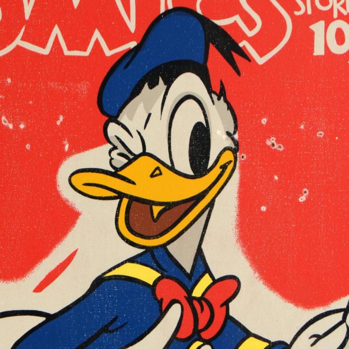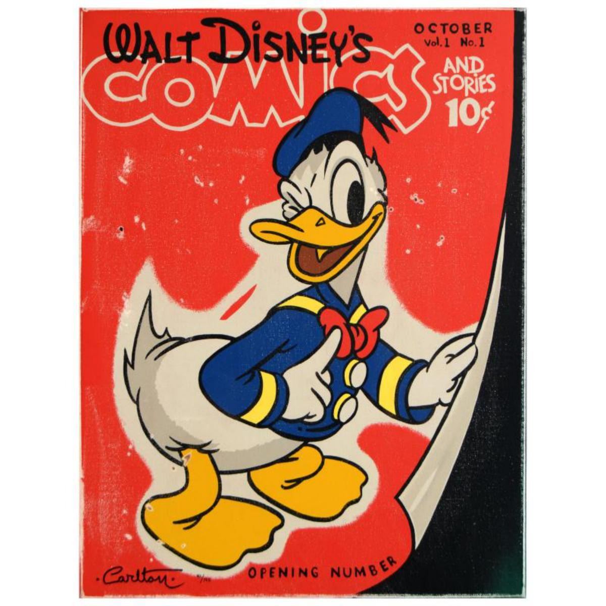 "Donald's Opening Number" is a limited edition giclee on gallery wrapped canvas, numbered 42 out of 195 and hand signed by Trevor Carlton. This piece is licensed by Disney Fine Art. Includes Certificate of Authenticity! Measures approx. 18" x 24" (image). ** Please note: there is wear to the edges, and noticeable puncture marks on the face of the piece. ** Reference #: 216765