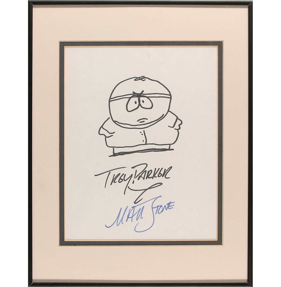 Original signed felt tip sketch of Cartman on an off-white 8.5 x 11 sheet, done by Trey Parker, signed in black felt tip by Parker and in blue felt tip by Matt Stone. Double matted and framed to an overall size of 11.25 x 14.25. In fine condition.