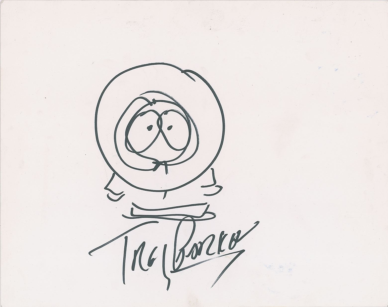 Original felt tip sketch of Kenny McCormick from the animated television series South Park on a white 14 x 11 sheet, signed below by Trey Parker. In fine condition, with some faint smudges to the background.