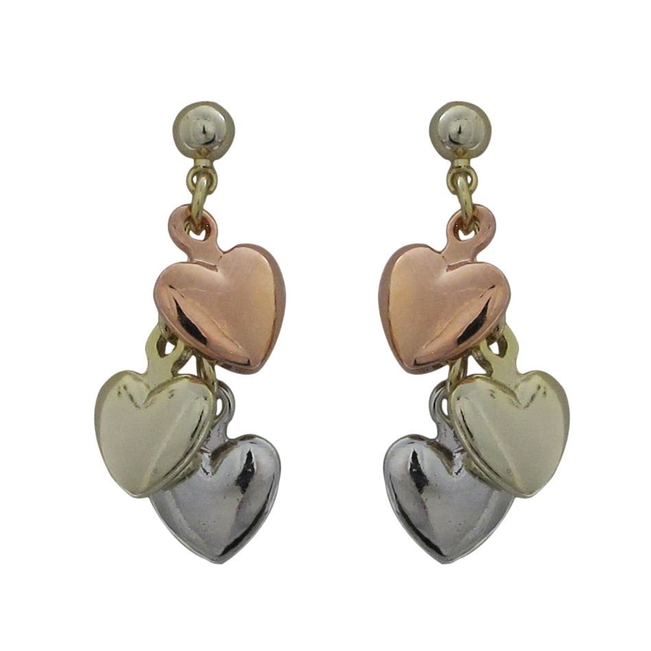 Tri Color Brass Three Dangling Hearts On Ball Post Earrings- 1.15"