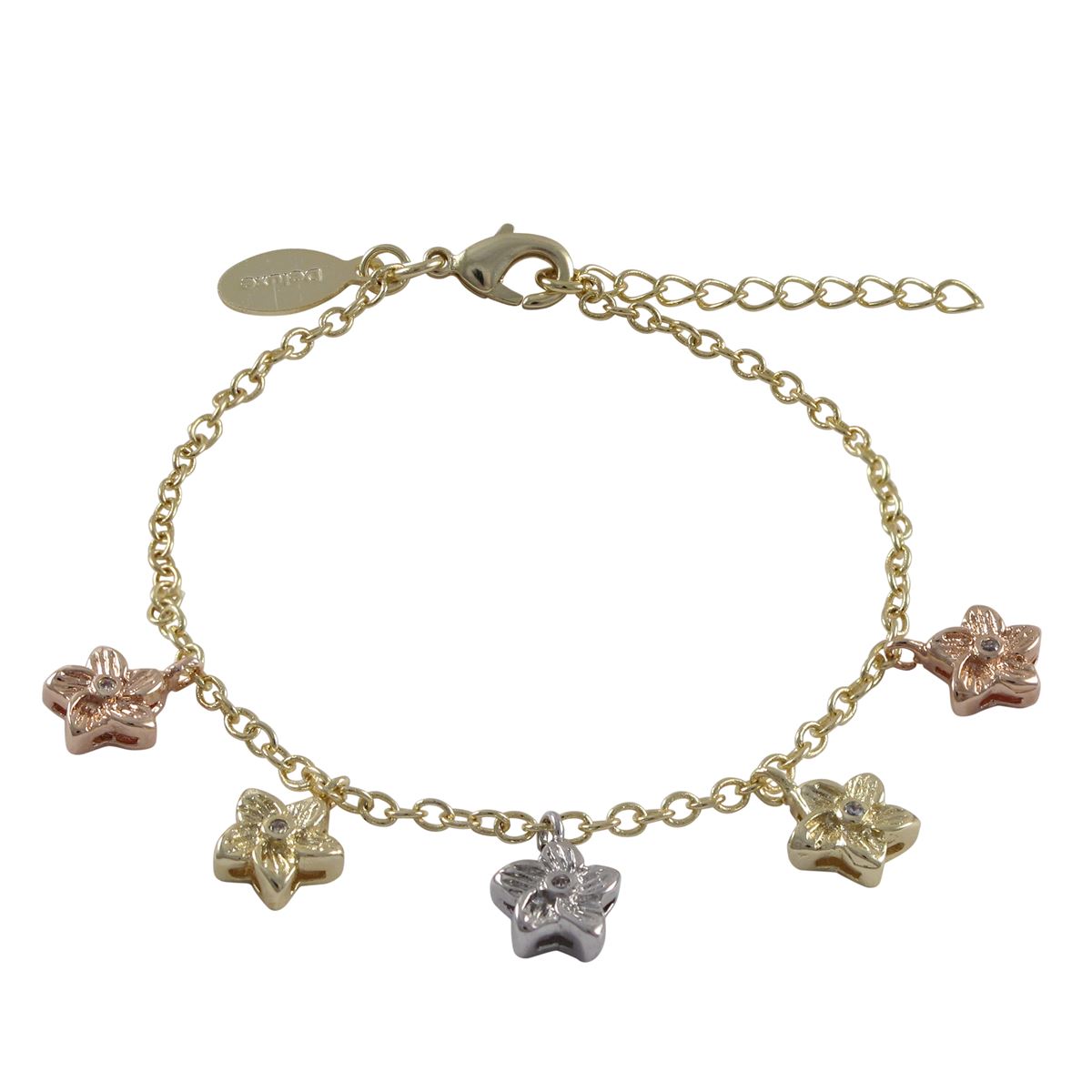 Tri Color Flower Charms Dangling, Gold Plated Brass Chain Bracelet, 5&Quot; 1&Quot;