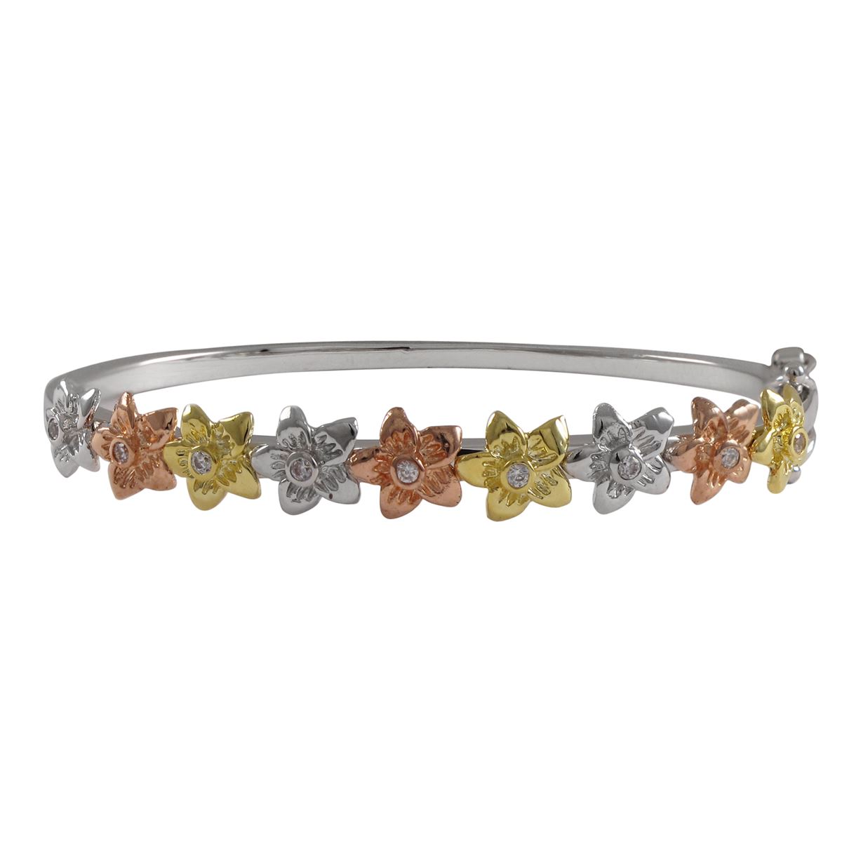 Tri Color Flowers With White CZ Center Silver Color Brass Bangle, 42Mm