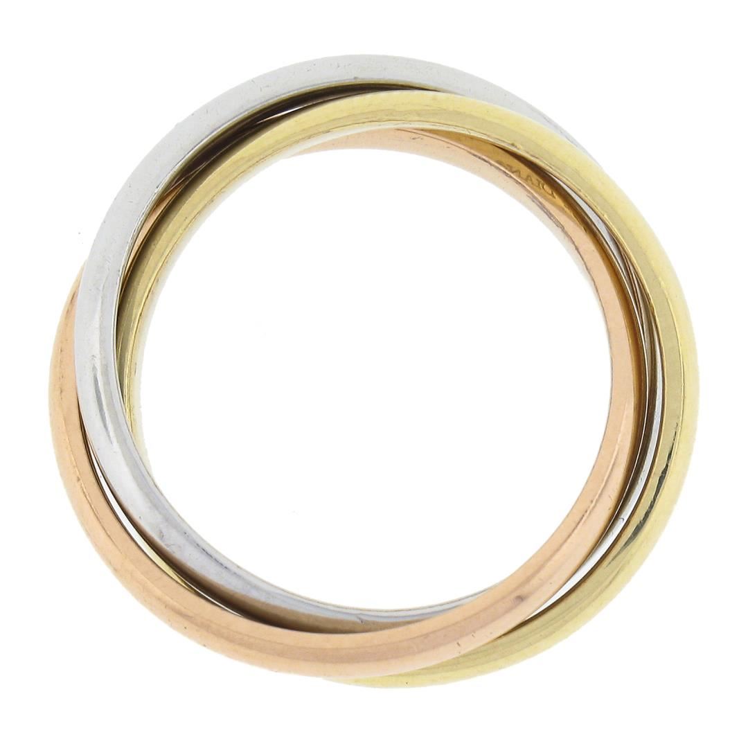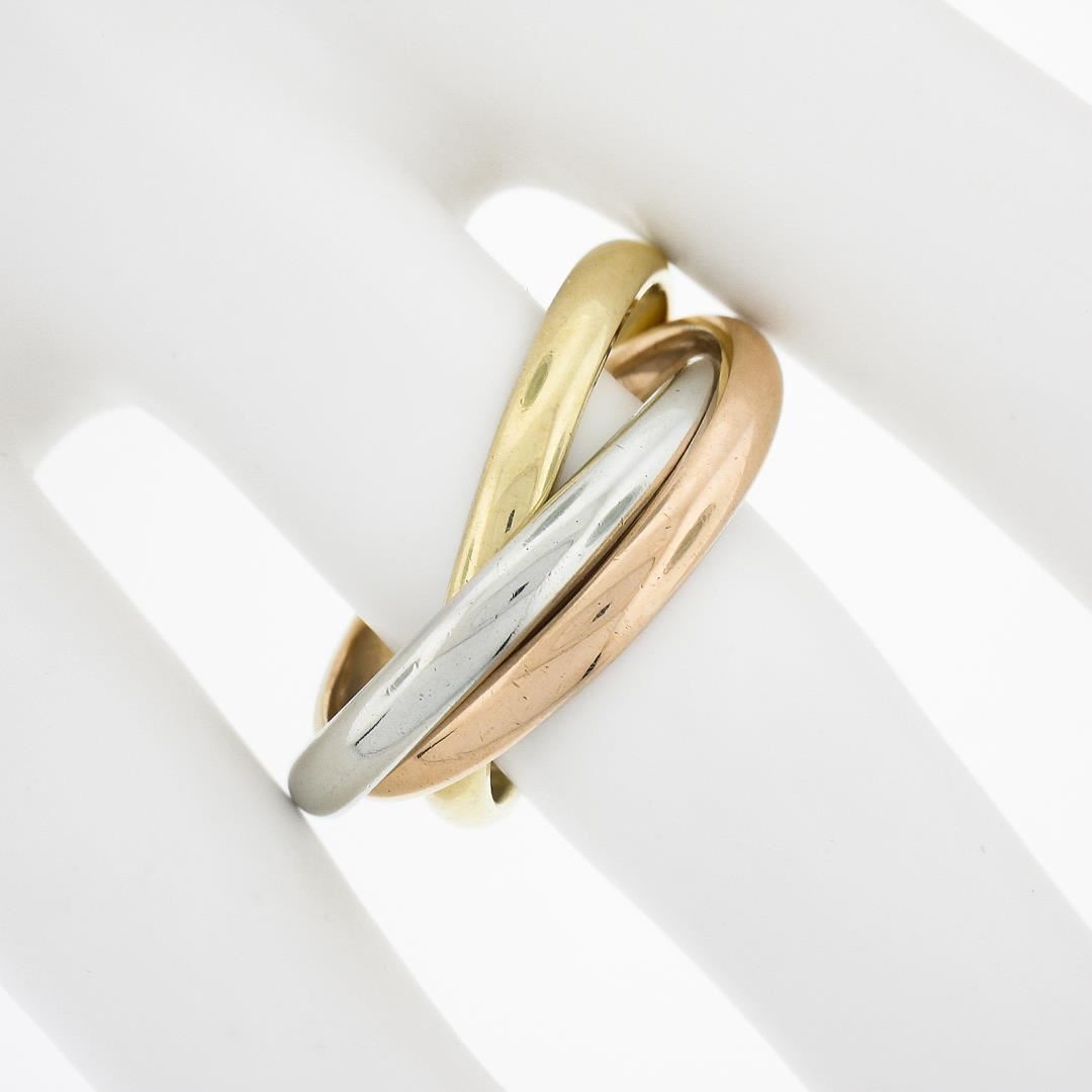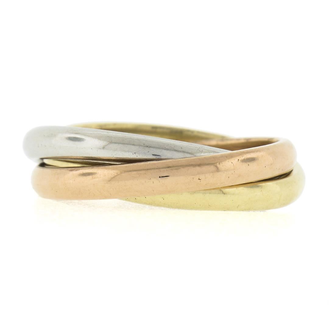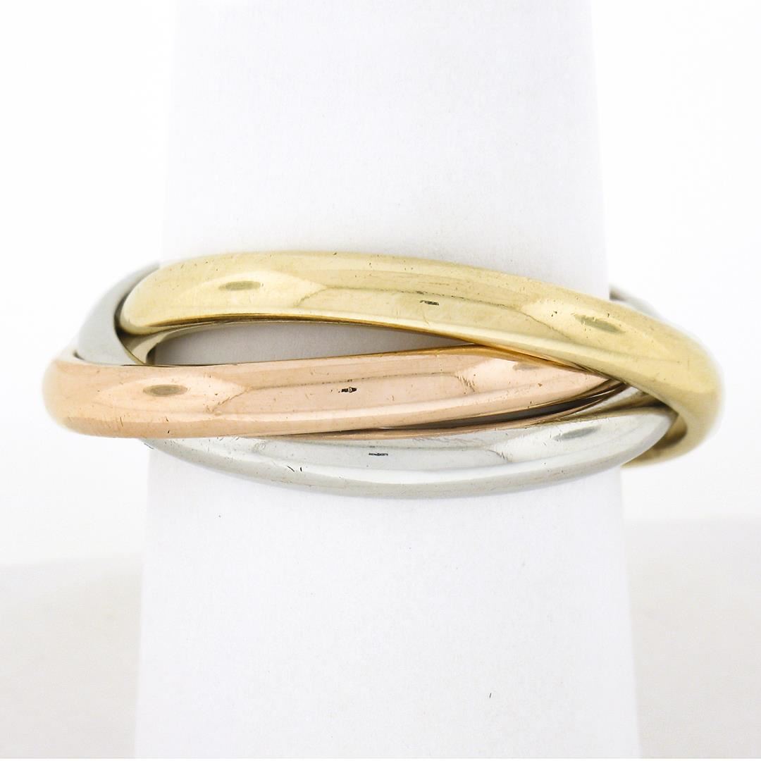 A solid yellow & rose gold w/ platinum trinity three band ring. The ring is size 9.5, weighs a total of 14.08 grams, and measures 6.3mm wide.