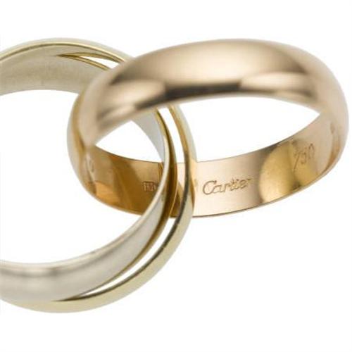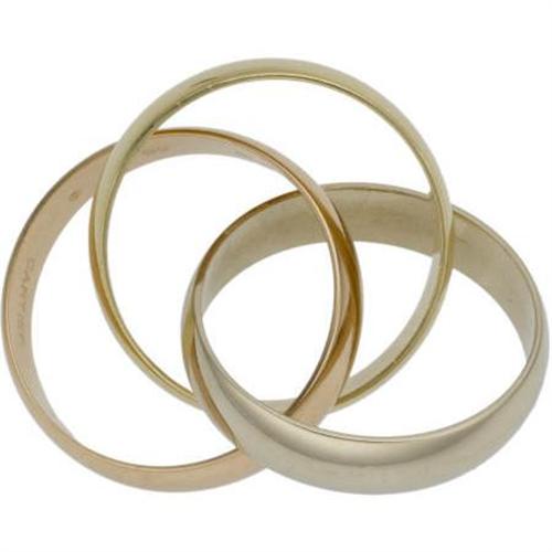 <B>Tri-Color Gold Ring, Cartier</B></I><BR><BR>The trinity ring consists of three bands in 18k white gold, pink gold, and yellow gold. Stamped Cartier. Gross weight 15.00 grams. <BR>*Note: Size 8-1/2 (not sizeable) <B>Condition Report:</B> Very good condition.<BR><BR><b>Shipping:</b> Miscellaneous Collectibles, Smal (<a target="_blank" href="http://www.heritageauctions.com/common/shipping.php">view shipping information</a>)
