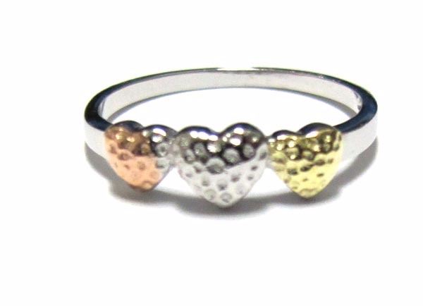 Tri Color Hammered Hearts, Sterling Silver Ring Size 6