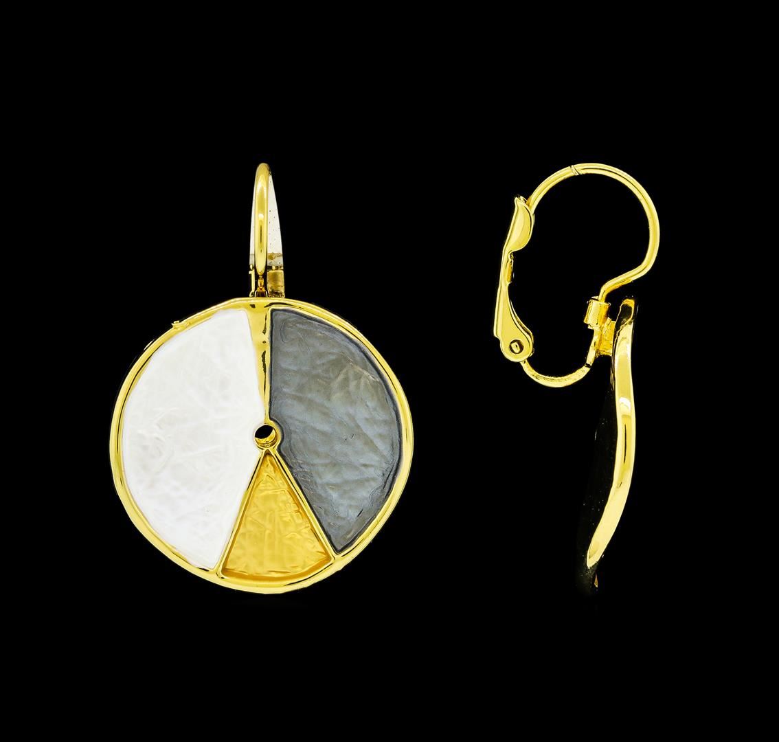 High end designer jewelry. Tri Color Hand Painted Medallion Earrings - Gold Plated. Gold Plated Metal/1.5" Dangle. Gold/ Multi. FrenchClip. Total Weight: 6.2 grams.
