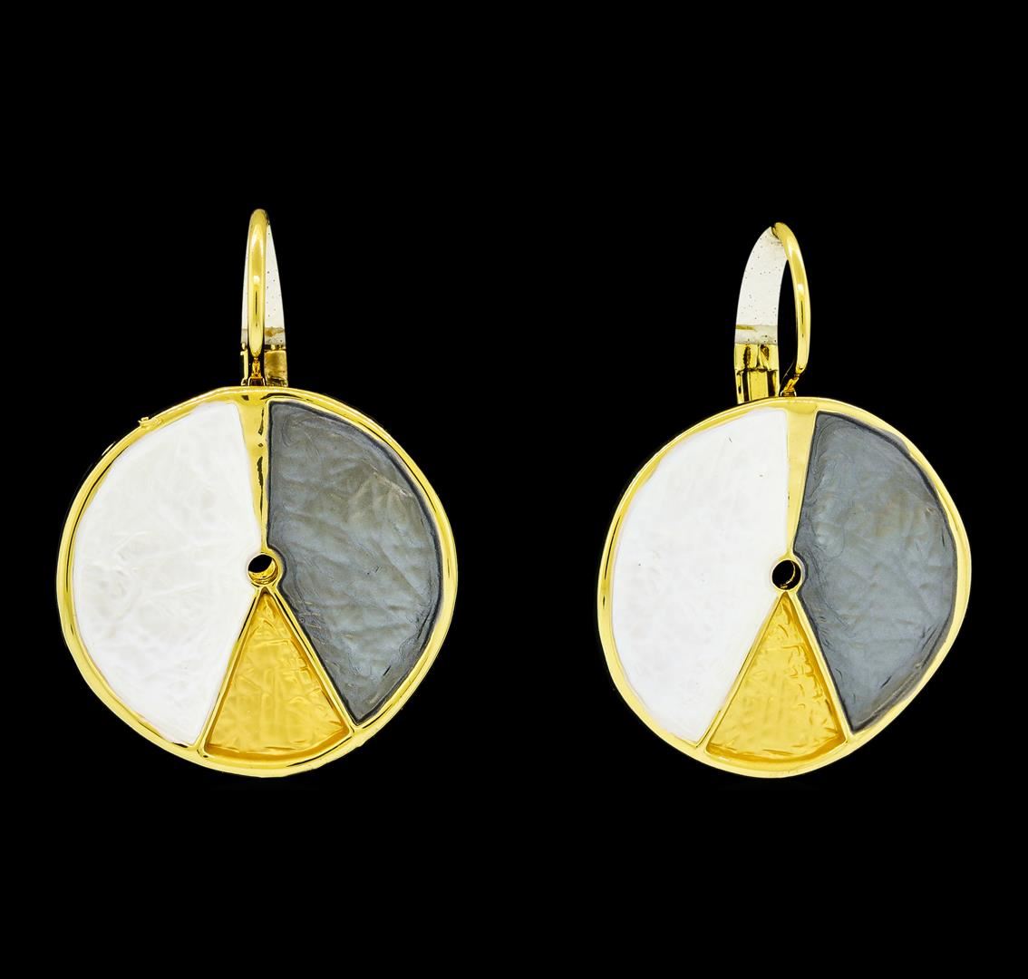 High end designer jewelry. Tri Color Hand Painted Medallion Earrings - Gold Plated. Gold Plated Metal/1.5" Dangle. Gold/ Multi. FrenchClip. Total Weight: 6.2 grams.