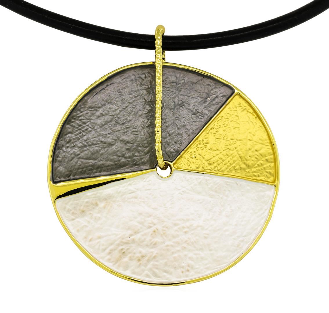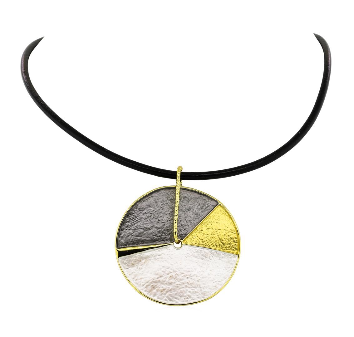 High end designer jewelry. Tri Color Hand Painted Medallion Necklace - Gold Plated. Gold Plated/3" Ext Clasp/ Leather Cord. Black/ Gold. 16inches. Total Weight: 19.7 grams.