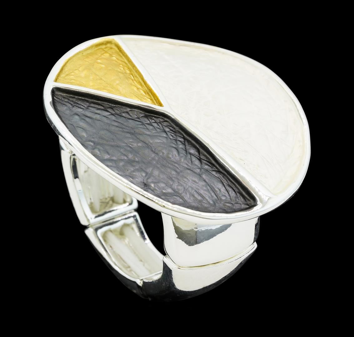 High end designer jewelry. Tri Color Hand Painted Medallion Ring - Rhodium Plated. Rhodium Plated Matte Metal. Silver/ Multi. Elastic. Total Weight: 12.1 grams.
