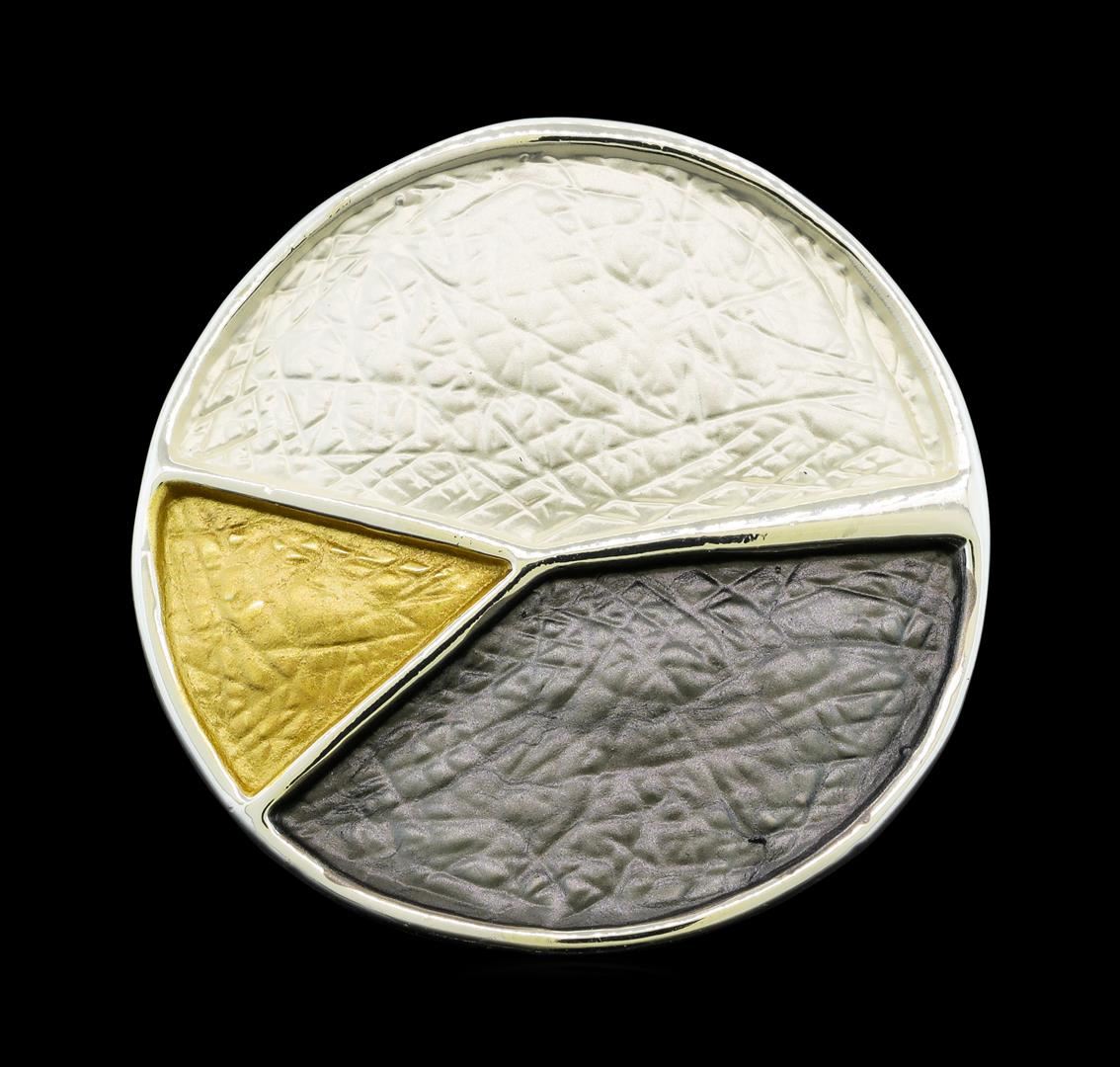 High end designer jewelry. Tri Color Hand Painted Medallion Ring - Rhodium Plated. Rhodium Plated Matte Metal. Silver/ Multi. Elastic. Total Weight: 12.1 grams.