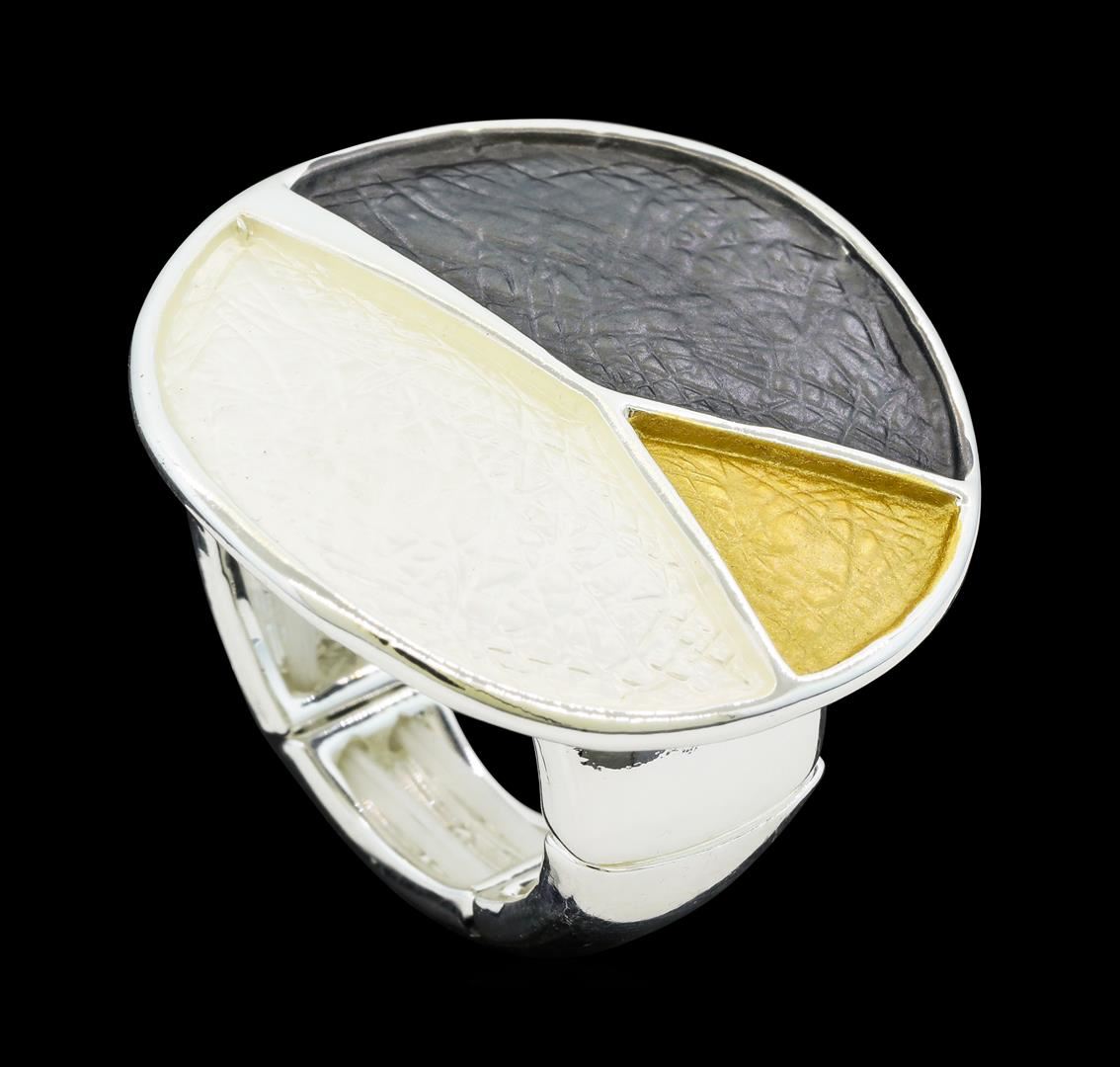 High end designer jewelry. Tri Color Hand Painted Medallion Ring - Rhodium Plated. Rhodium Plated Matte Metal. Silver/ Multi. Elastic. Total Weight: 11.7 grams.