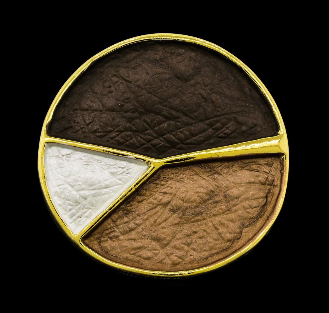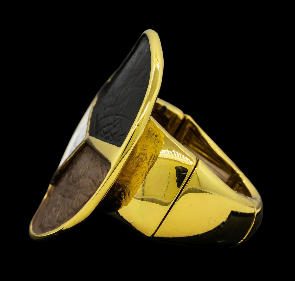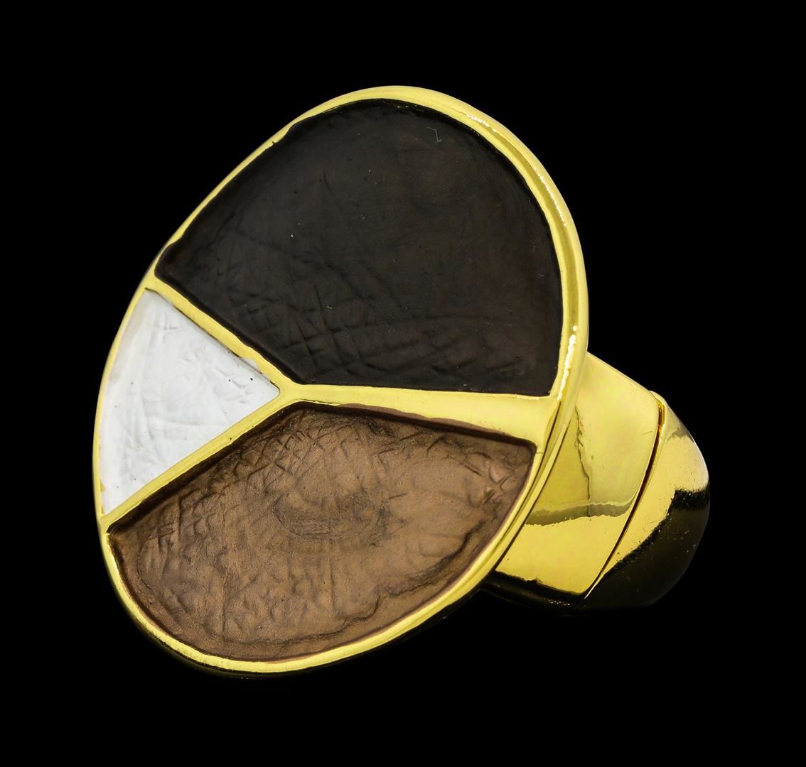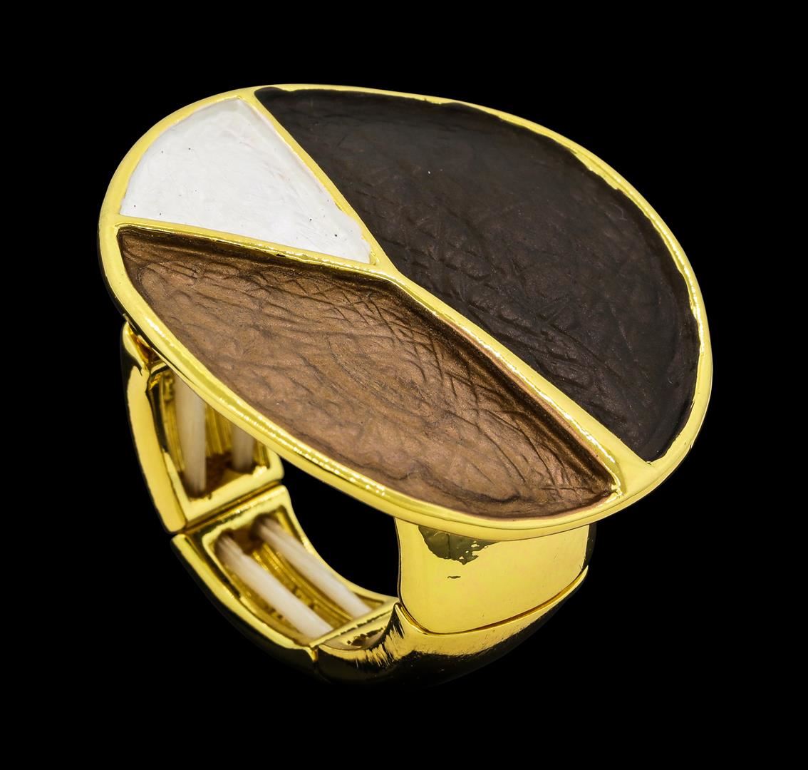 High end designer jewelry. Tri Color Hand Painted Round Ring - Gold Plated. Gold Plated Matte Metal. Gold/ Brown. Elastic. Total Weight: 11.3 grams.