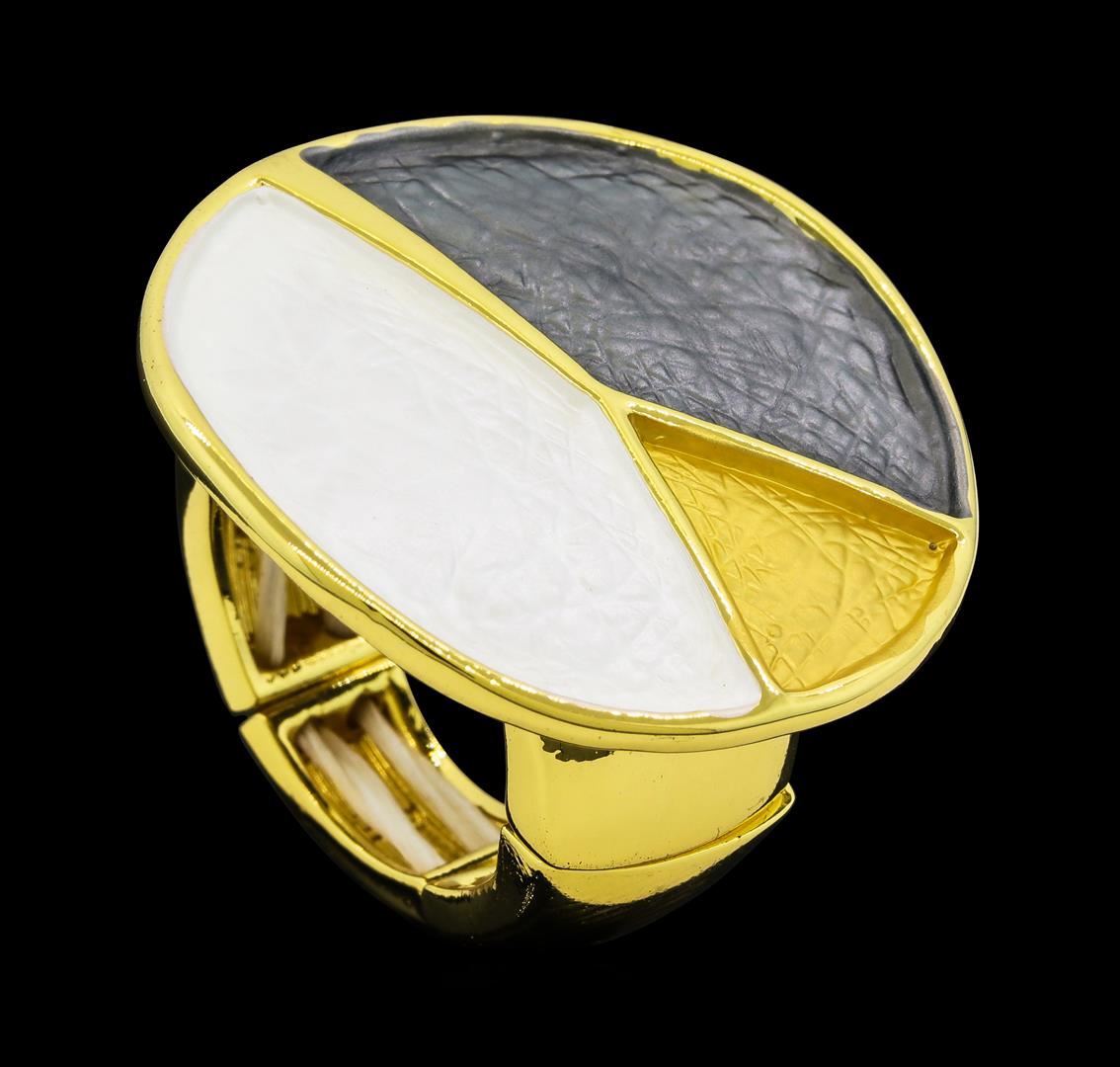 High end designer jewelry. Tri Color Hand Painted Round Ring - Gold Plated. Gold Plated Matte Metal. Gold/ Multi. Elastic. Total Weight: 11.9 grams.