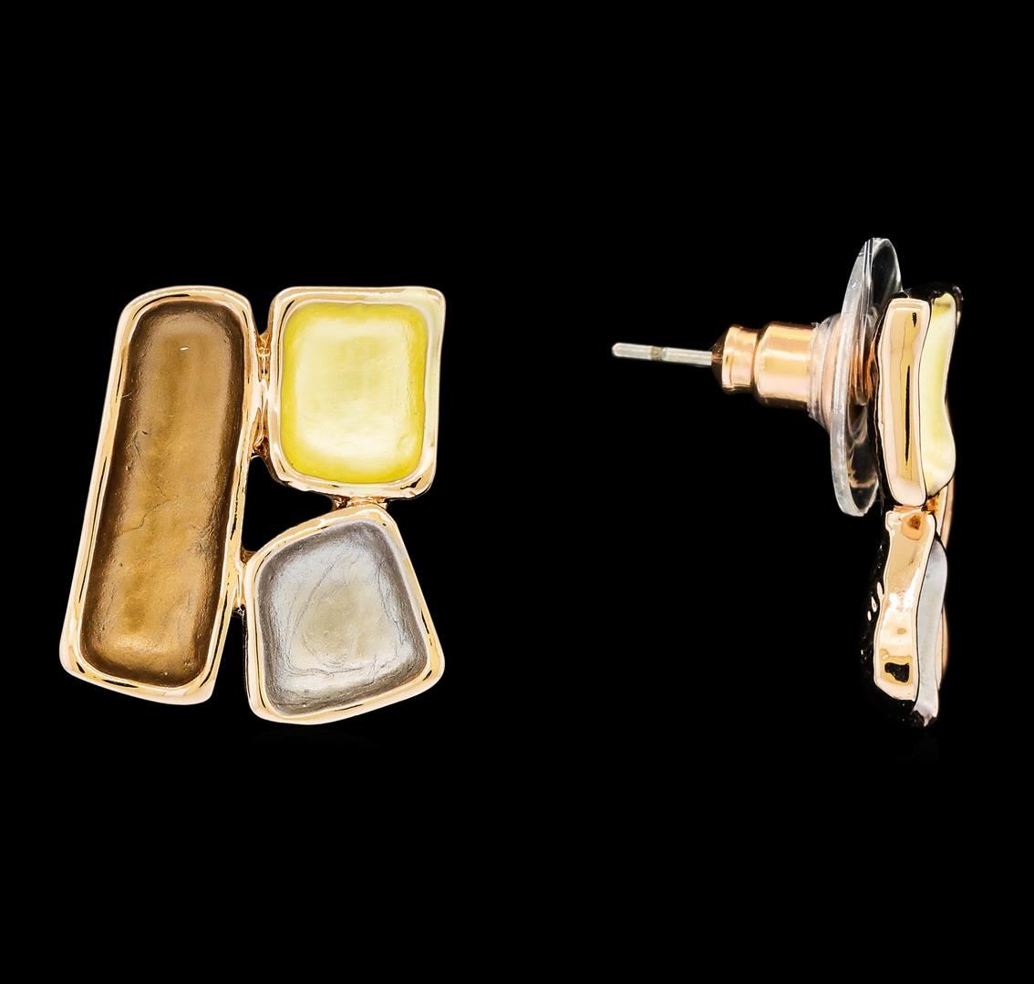 High end designer jewelry. Tri Color Rectangle Earrings - Rose Gold Plated. Rose Gld Plated Set. Choc/ Van/ Cof. Post. Total Weight: 5.1 grams.
