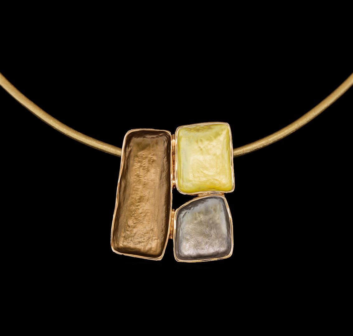 High end designer jewelry. Tri Color Rectangle Pendant Necklace - Rose Gold Plated. Rose Gld Plated/3" Ext Clasp. Choc/ Van/ Cof. 16inches. Total Weight: 14.6 grams.