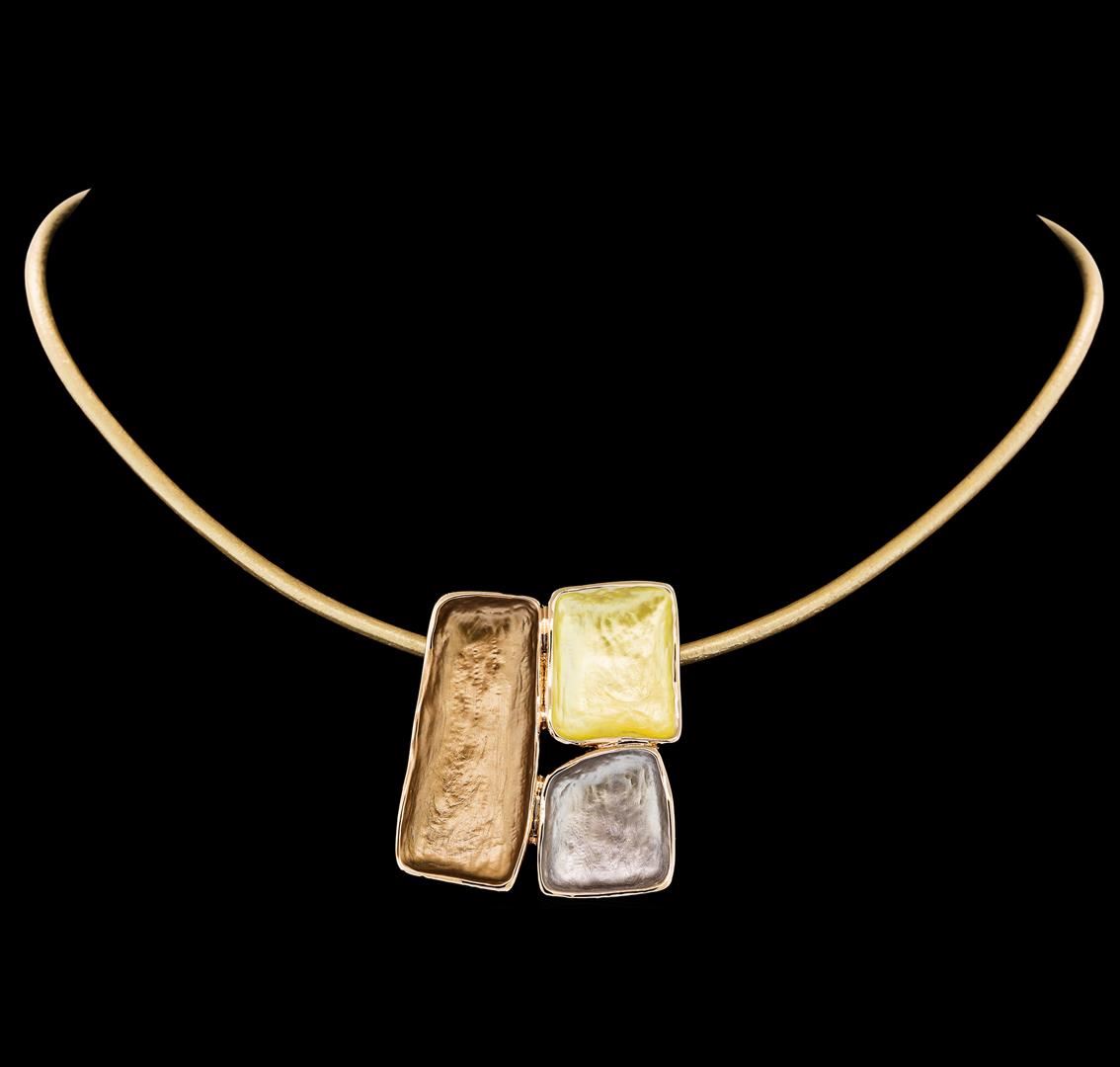 High end designer jewelry. Tri Color Rectangle Pendant Necklace - Rose Gold Plated. Rose Gld Plated/3" Ext Clasp. Choc/ Van/ Cof. 16inches. Total Weight: 14.6 grams.
